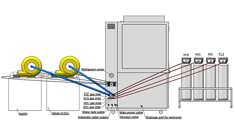 LIB 산업의 챔버는 10 ppb ~ 500 ppb 범위의 농도에서 H2S, SO2, NO2 및 Cl2 의 혼합물을 정확하게 제어하여 부식성 대기의 정확한 복제를 보장합니다. 질량 흐름 제어기 (MFC) 는 가스당 0.5 내지 2.0 mL/min 사이의 안정한 유속을 유지하여 모든 샘플에 대해 일관된 노출을 가능하게 한다.