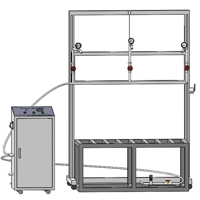 | 직경 Φ5mm 의 스테인레스 스틸 노즐이 장착되어 있으며, 자연 빗방울 착륙 지점을 시뮬레이션하기 위해 조정 가능한 높이 브래킷에 설치됩니다. | 유량 제어 밸브와 압력 게이지는 물의 흐름이 안정적인지 확인하고 정확한 모니터링을위한 유량계가 장착되어 있습니다. |